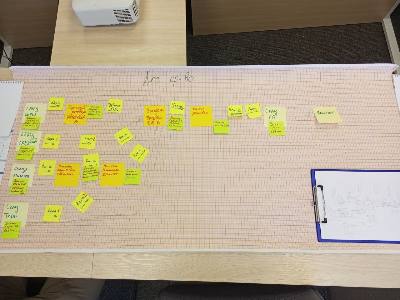 Данные, собранные на участках, позволили сформировать укрупненную карту потока создания ценности текущего состояния. Найден критический, самый длинный путь, оказывающий максимальное влияние на время протекания процесса. Именно по нему в дальнейшем будут строиться работы по картированию и поиск потерь в потоке.