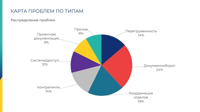 В течение 4 недель администраторы объектов проводили производственный анализ, в ходе которого выявили несколько категорий проблем, большая часть которых связана с документооборотом, взаимодействием между отделами и перегрузкой сотрудников.